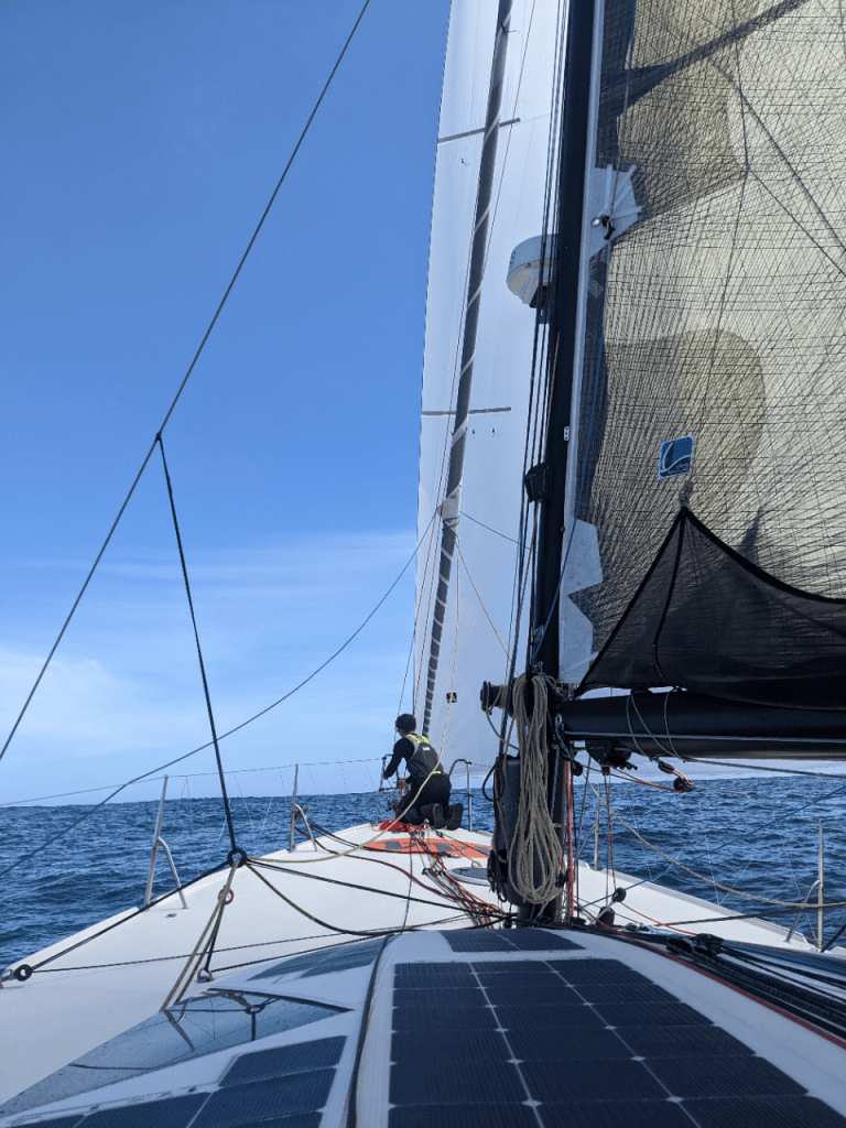 Kite and her happy crew spent another day of dieting blasting down the Celtic Sea to Land’s End and then further south to a mark off Brest. Overnight and then around mid day the Celtic Sea gave us a proper welcome with up to 35-37kts and a confused sea that certainly wasn’t small. The conditions were variable enough to let us practice reefing and unreefing and changing between the J1 and J2. As Wednesday ends, we are blasting across “la manche” with the 0 up. But it is feeling lonely and the J2 will soon join it as a stay sail.