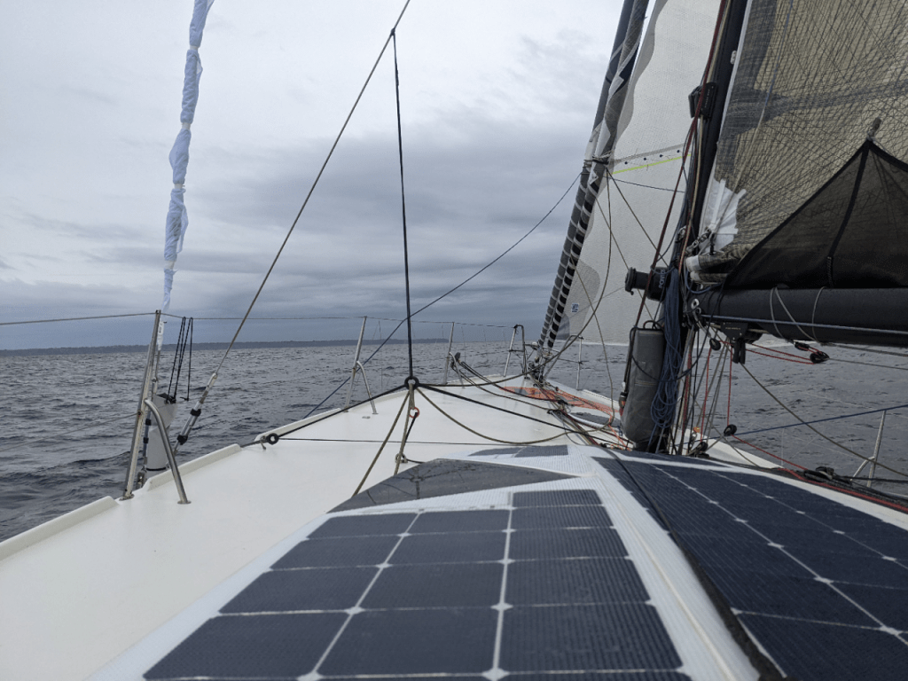 We had a busy night. It was windy, mainly around 25. We had the code 5 up which is a furling sail on a cable and the head came unlashed from the cable. That means it doesn’t furl right. We did get it furled albeit poorly and then quickly down. There was some good luck in that as it was over 25 at the time, and you can’t douse one of those like a spinnaker without a sock.
