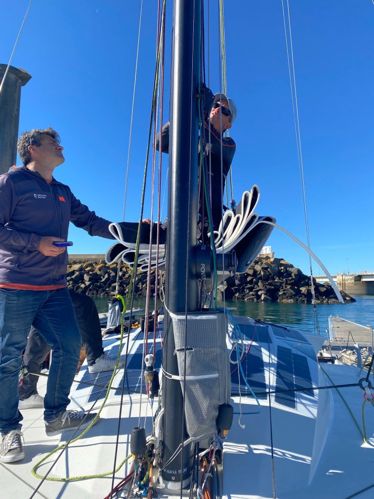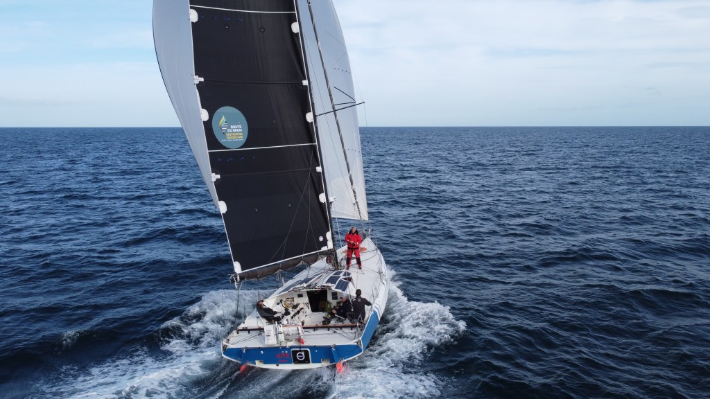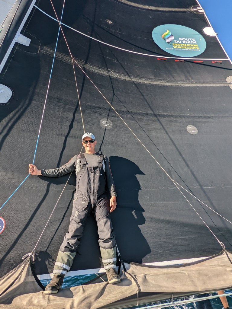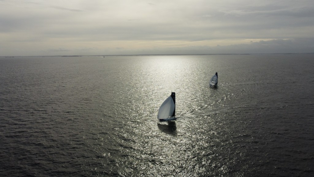We had one last training day before the Route du Rhum. It was great to get both spinnakers out with the new tack zips and work through maneuvers one more time. It was even better for Polkadot (Alex Mehran, USA154) to be out as well. Here are some of Alex’s drone shots while we both had the fractional spinnakers: